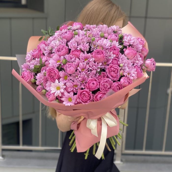 Хризантема гранд пинк – 14 шт. кустовая пионовидная роза misty bubbles – 10 шт. Писташ – 5 шт. Оформление – 1 шт.