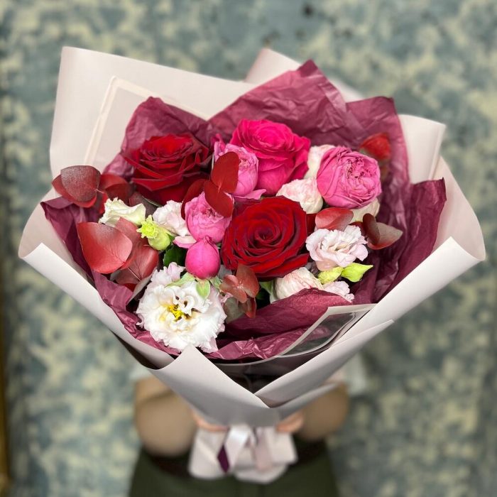 Роза Pink Floyd – 1 шт.Роза Эксплорер – 2 шт.роза кустовая пионовидная джульетта церайз – 1 шт.роза кустовая пионовидная мэнсфилд парк – 1 шт.эустома розовая – 1 шт.Эвкалипт – 1 шт.Тишью – 2 шт.Пленка матовая – 5 шт.Лента атласная – 2 шт.
