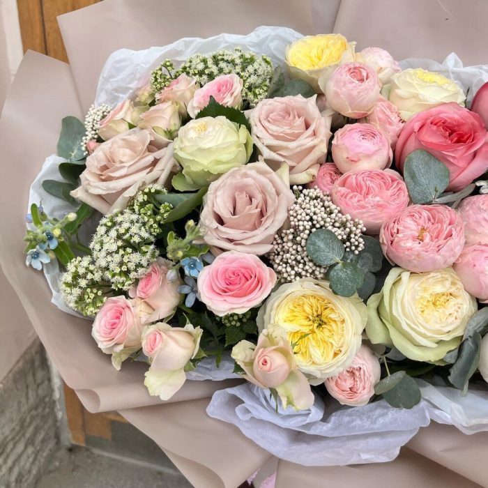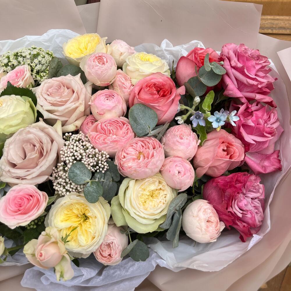 Альстромерии, Кустовые розы, Лизиантусы, Пионовидные розы, Розы, Ромашки
