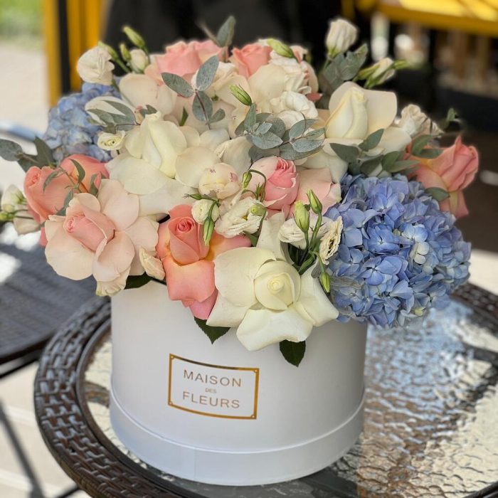 Сборная корзина из гортензий, лизиантусов, гвоздик, хризантем и роз