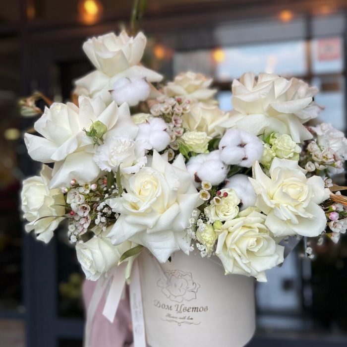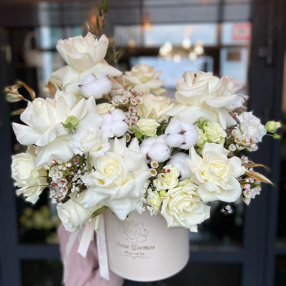 Белые сочетания в стильной шляпной коробке – это практичный и интересный подарок для любого праздничного события. Воздушная ассиметричная сборка и текстурные цветы создают объемную композицию, которая воодушевляет и дарит эстетическое удовольствие.Доставим быстро и бережно.* … Показать ещёК сожалению, мы не можем гарантировать 100% копию букета. Ежедневно к нам в салон приезжают свежие цветы и они могут отличаться друг от друга. Со своей стороны, мы гарантируем соблюсти состав и общий стиль вашего букета. При возникновении вопроса о замене дизайнерской упаковки – мы обязательно свяжемся с вами. Букет из живых цветов мы начинаем собирать после оформления заказа.