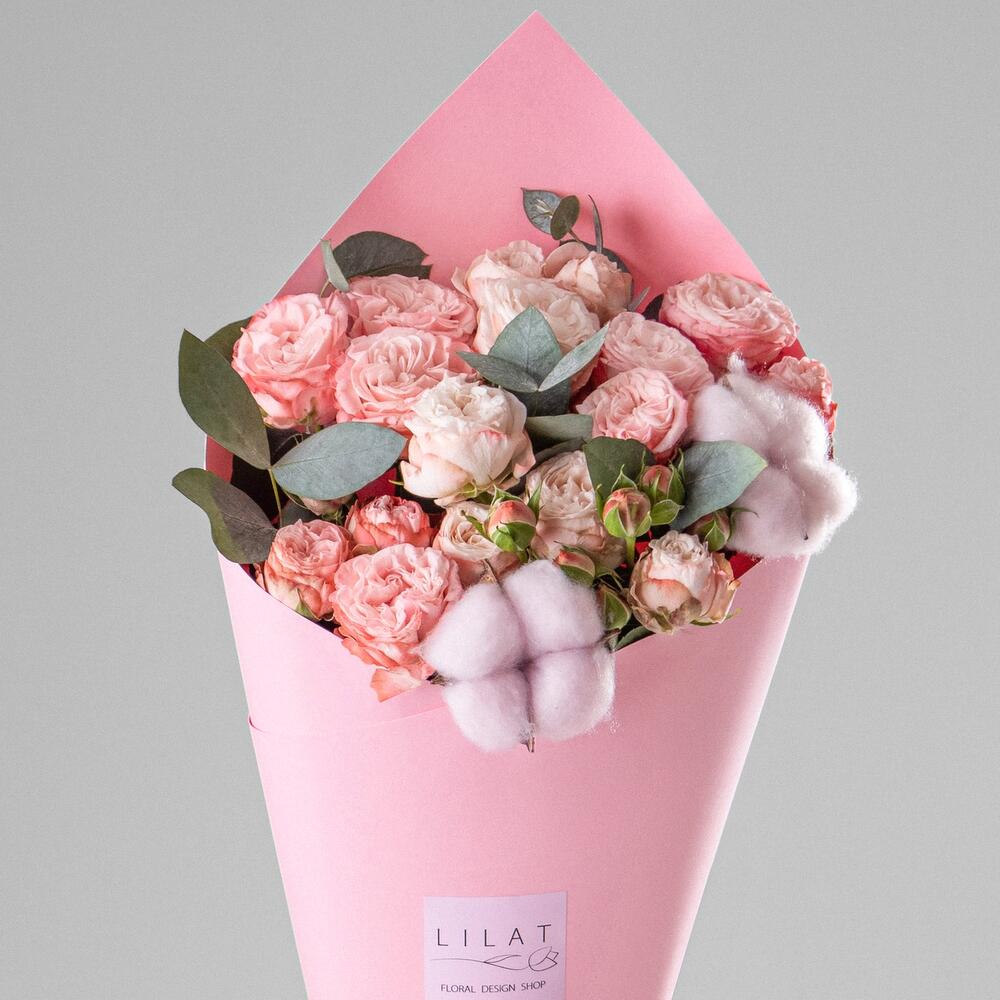 кустовые пионовидные розы – 19 шт. Упаковка дизайнерская – 1 шт. Оазис флористический – 1 шт. Эвкалипт – 2 шт. Открыточка с вашими пожеланиями – 1 шт.