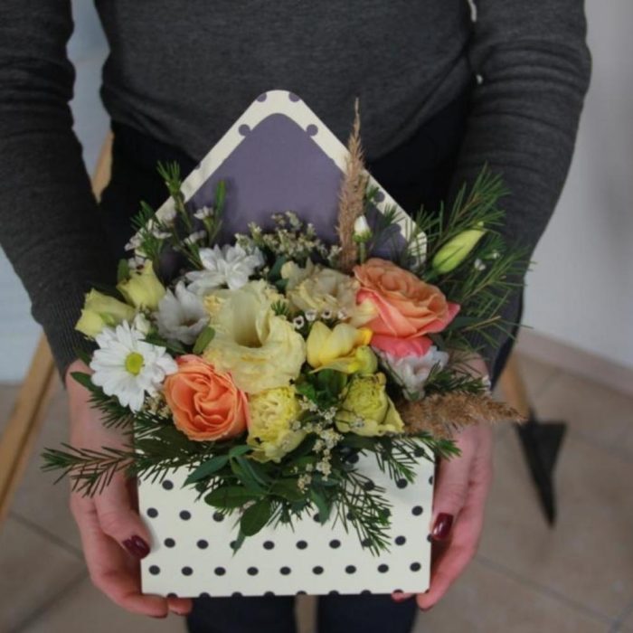 Хризантема кустовая – 2 шт.Роза – 1 шт.Эустома – 2 шт.Фисташка пучок – 1 шт.Оазис флористический – 1 шт.конверт картонный – 1 шт.сухоцветы пучок – 2 шт.