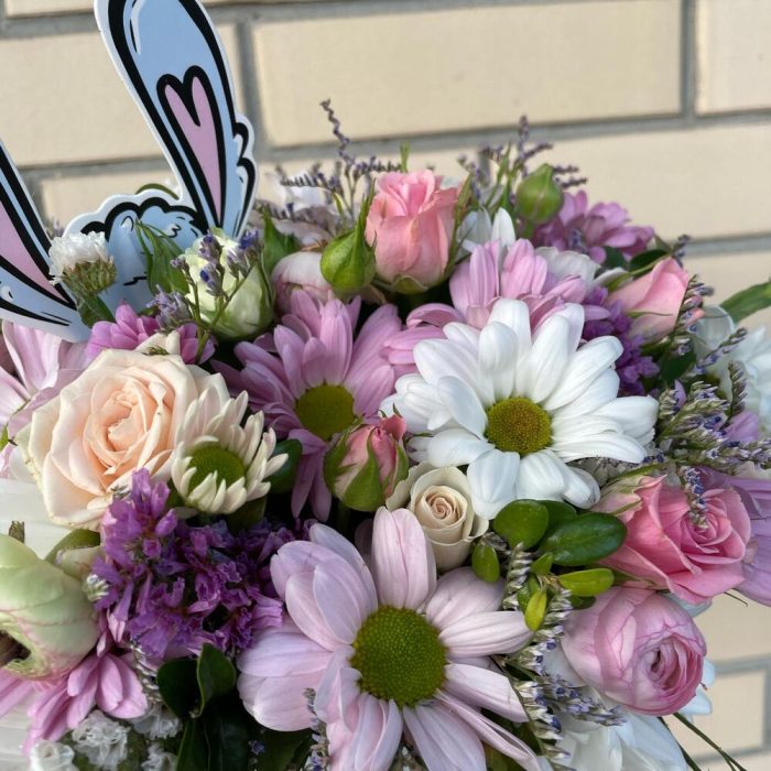 Роза кустовая – 2 шт.Хризантема кустовая – 3 шт.Лимониум – 2 шт.Статица – 2 шт.Ранункулюс – 1 шт.Самшит – 1 шт.Губка флористическая – 1 шт.коробка для цветов – 1 шт.