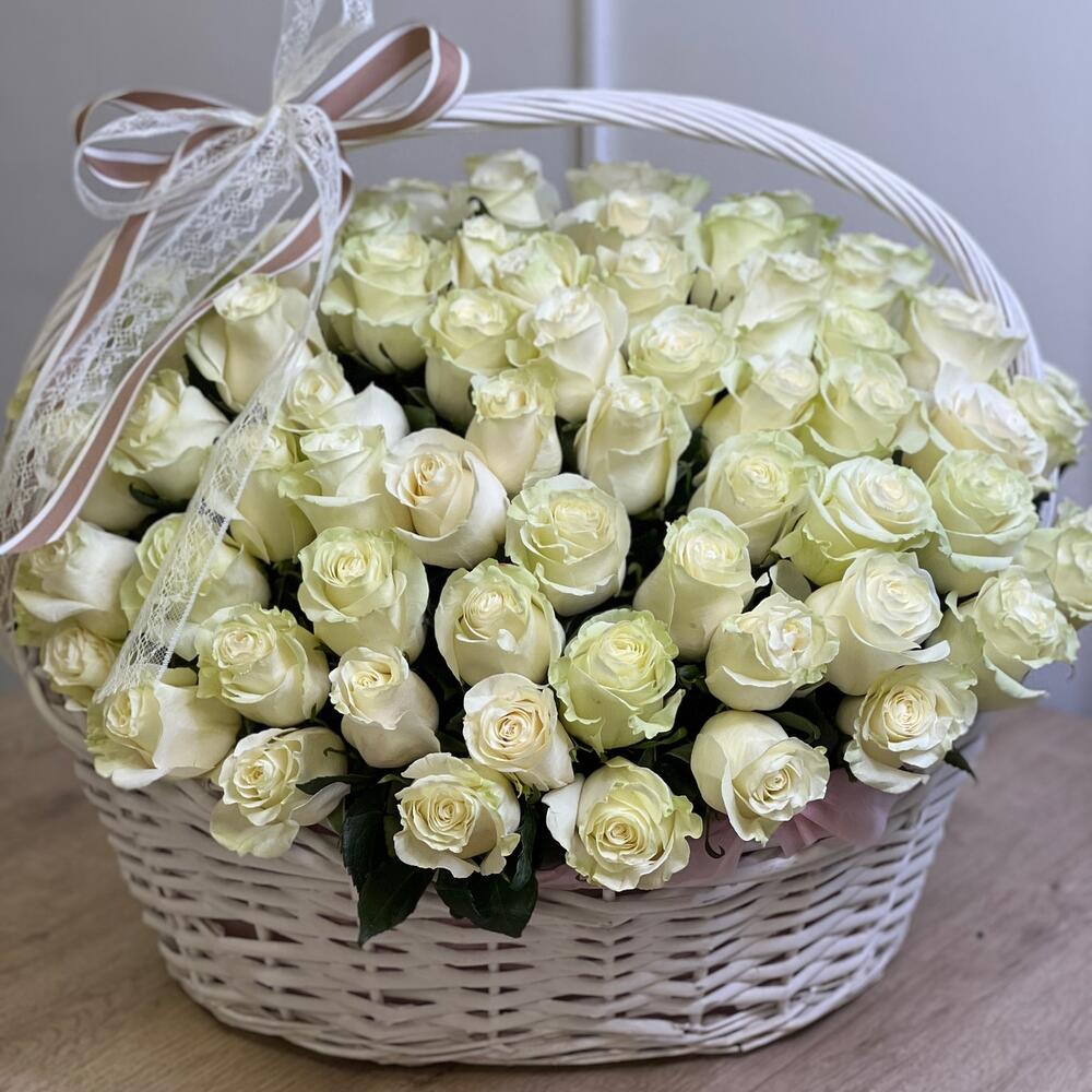 Роза белая мондиаль – 101 шт. Корзина – 1 шт. Оазис – 6 шт. Оформление – 1 шт.