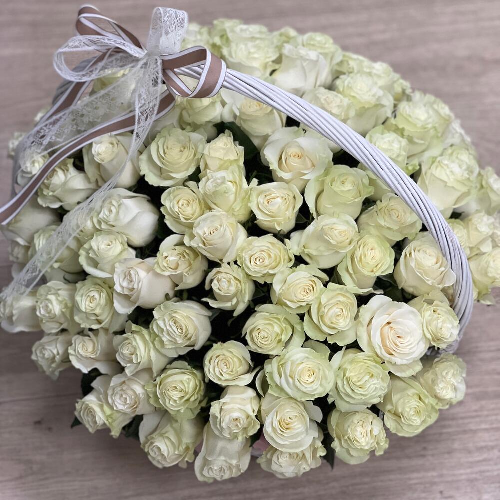 Метки: 101 роза, 14 февраля, Белые розы, от 5000 руб, Роза Роза 40 см, Розы в корзине, цветы в корзине