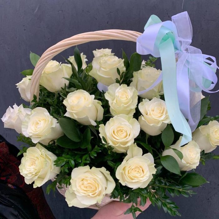 Корзина с 25 белыми розами «Аваланш»