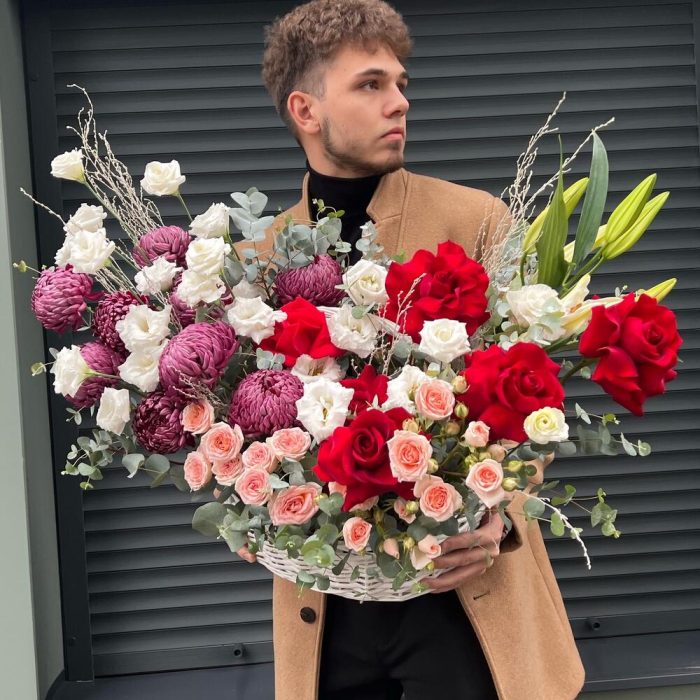 Альстромерии, Гвоздики, Кустовые розы, Лизиантусы, Розы, Хризантемы