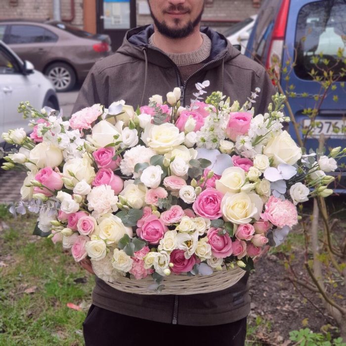 Лента атласная – 3 шт.Корзина плетеная большая – 1 шт.Маттиола белая – 3 шт.Роза белая 50 см – 16 шт.Оазис флористический – 3 шт.Роза розовая 50 см – 19 шт.эустома белая – 7 шт.Эвкалипт Baby Blue – 5 шт.Роза кустовая белая 50 см – 3 шт.гвоздика белая сортовая – 5 шт.роза кустовая розовая пионовидная – 4 шт.гвоздика розовая диантус – 6 шт.октрытка ручной работы – 1 шт.