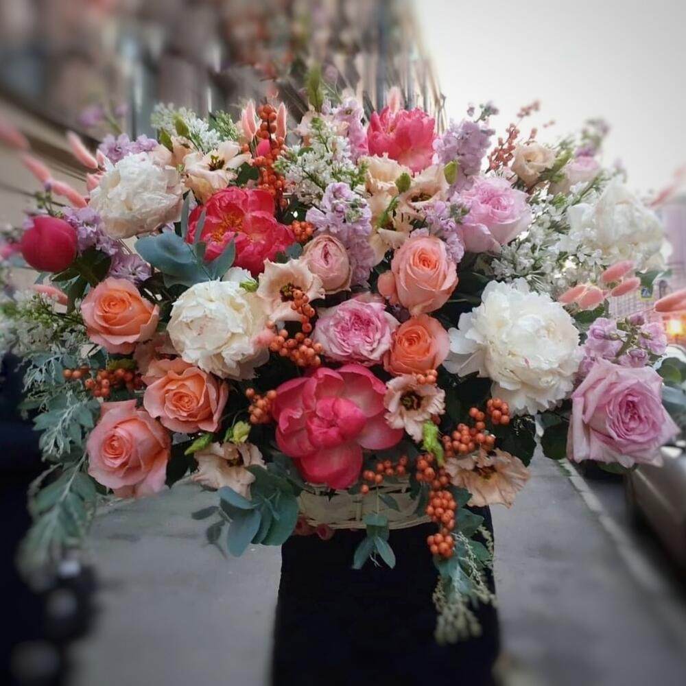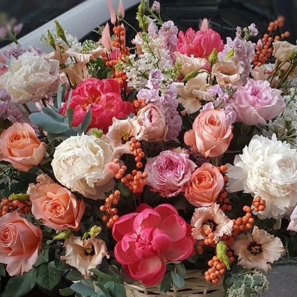 Корзина плетеная – 1 шт.Оазис флористический – 4 шт.зелень стаффаж пучок – 2 шт.мимоза листья – 10 шт.пионы – 10 шт.Маттиола – 10 шт.Роза одноголовая – 8 шт.Роза одноголовая пионовидная – 7 шт.Илекс – 7 шт.Эустома – 8 шт.Лагурус – 45 шт.Эвкалипт – 10 шт.