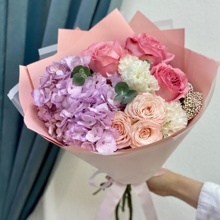 Гортензия – 1 шт.Озотамнус – 1 шт.Кустовая пионовидная роза – 1 шт.Пленка матовая – 2 шт.эустома белая – 1 шт.роза пинк экспрешн – 3 шт.эвкалипт 50 – 3 шт.