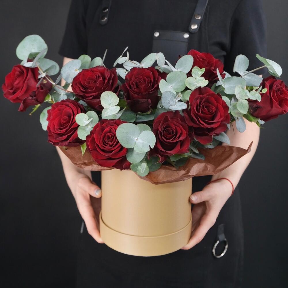 Красные розы с эвкалиптом в шляпной коробке