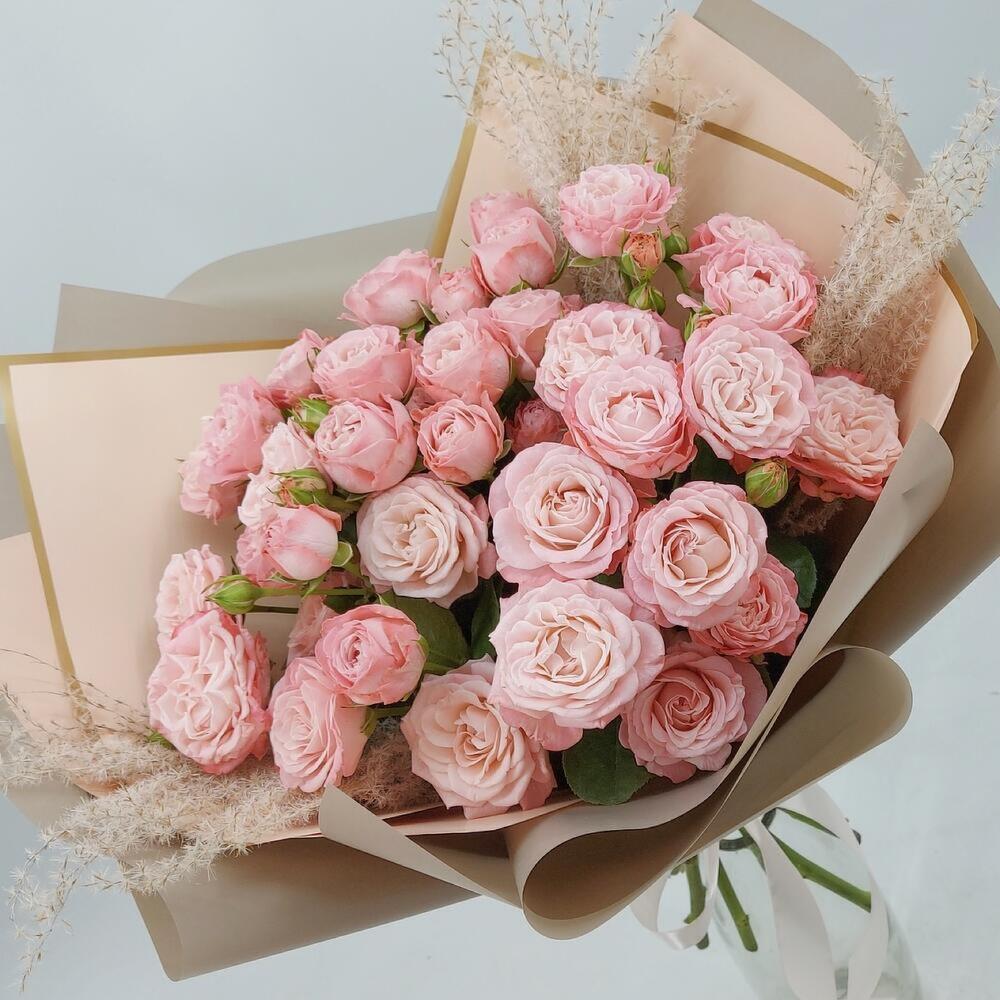 пионовидные кустовые розы – 9 шт. пампасная трава – 3 шт. Упаковка дизайнерская – 1 шт. Открыточка с вашими пожеланиями – 1 шт. инструкция по уходу за цветами – 1 шт.