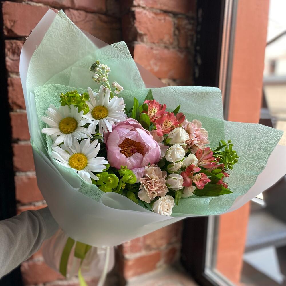 Пион – 1 шт.Буплерум – 3 шт.Диантус – 2 шт.Маттиола – 1 шт.Альстромерия – 2 шт.Кустовая роза – 1 шт.зелень декоративная – 5 шт.Упаковка дизайнерская – 1 шт.Лента атласная – 2 шт.Ромашка – 3 шт.
