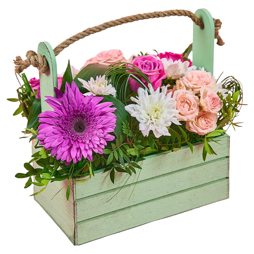 Аспидистра – 1 шт.Роза кустовая – 2 шт.Хризантема кустовая – 1 шт.Роза одноголовая – 3 шт.Берграсс – 1 шт.Гербера – 1 шт.Фисташка – 1 шт.Ящик деревянный – 1 шт.кирпич oasis классик – 1 шт.