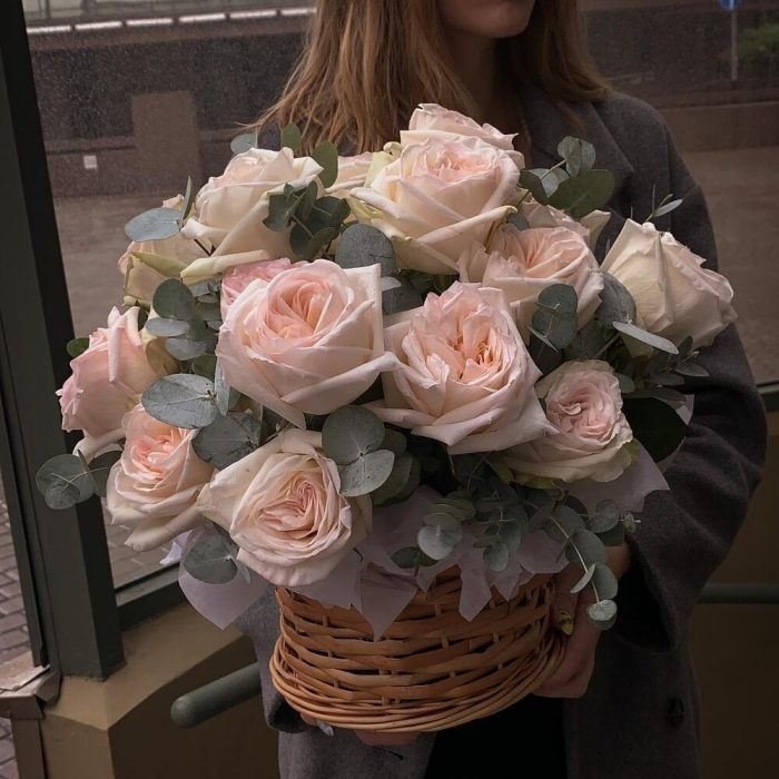 Роза пионовидная – 23 шт.Эвкалипт – 17 шт.Тишью – 2 шт.Корзина плетеная – 1 шт.