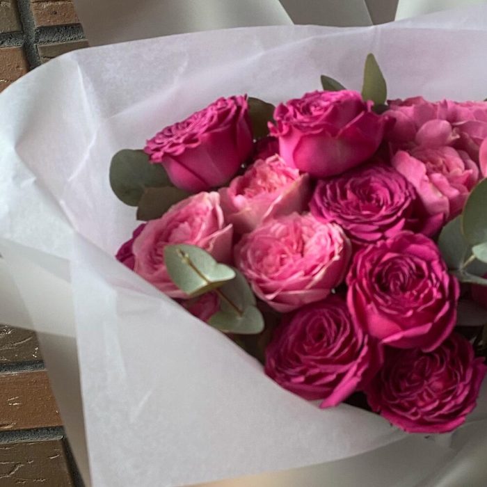 Роза кустовая – 4 шт.Эвкалипт – 2 шт.Лента атласная – 2 шт.Упаковка дизайнерская – 7 шт.