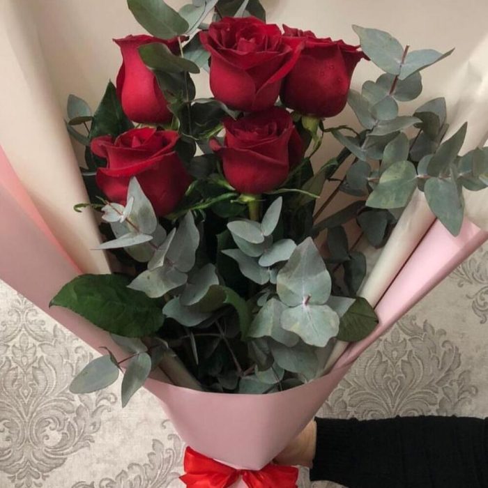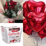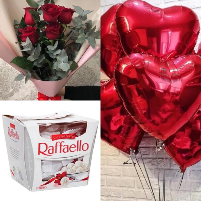 Эвкалипт – 2 шт. Раффаэлло – 150 гр. шары гелиевые фольгиррванные – 7 шт. розы красные – 5 шт.