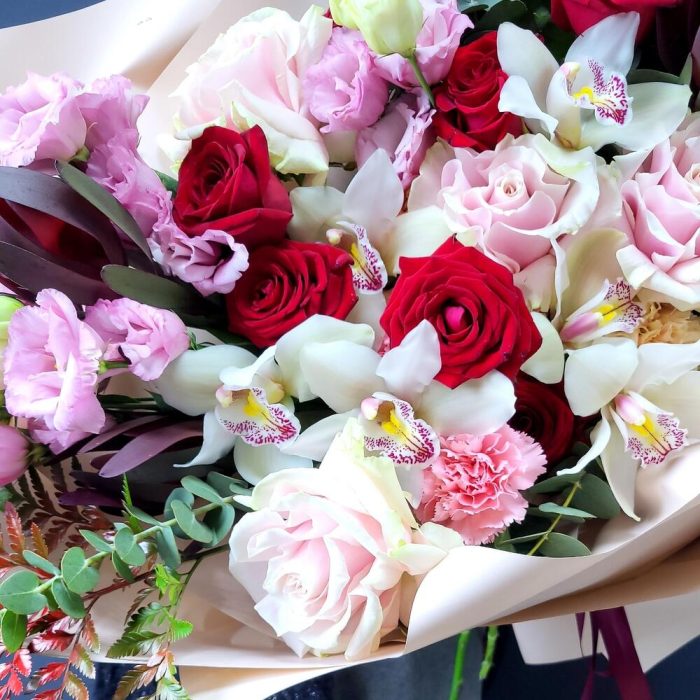 левкадендрон – 3 шт.Лизиантус – 5 шт.Орхидея Цимбидиум – 6 шт.Папоротник – 3 шт.Эвкалипт – 5 шт.Роза – 9 шт.Роза Эквадор – 6 шт.Гвоздика – 5 шт.Фисташка – 7 шт.Упаковка дизайнерская – 1 шт.