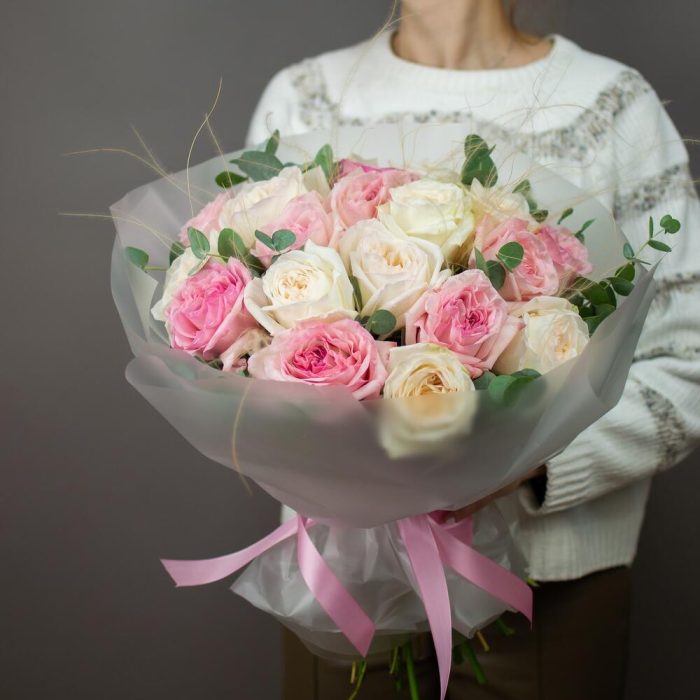Эвкалипт – 2 шт.Упаковка дизайнерская – 1 шт.Стифа – 3 шт.роза ароматная охара – 19 шт.
