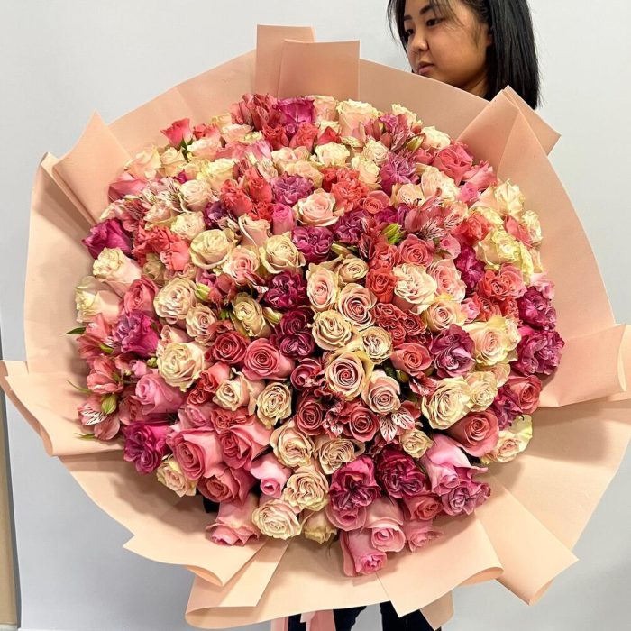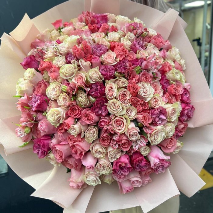 Альстромерии, Гвоздики, Кустовые розы, Лизиантусы, Розы, Хризантемы