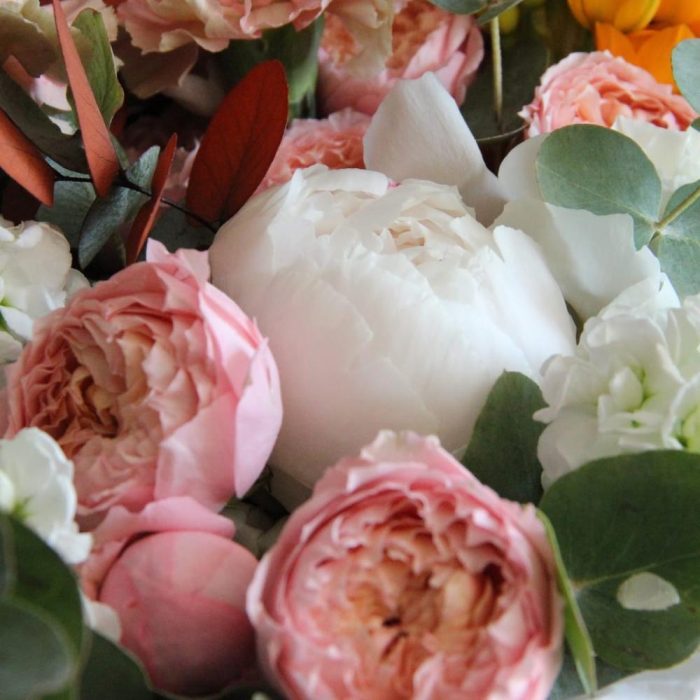 Персик – Букет с пионовидными розами и ранункулюсами
