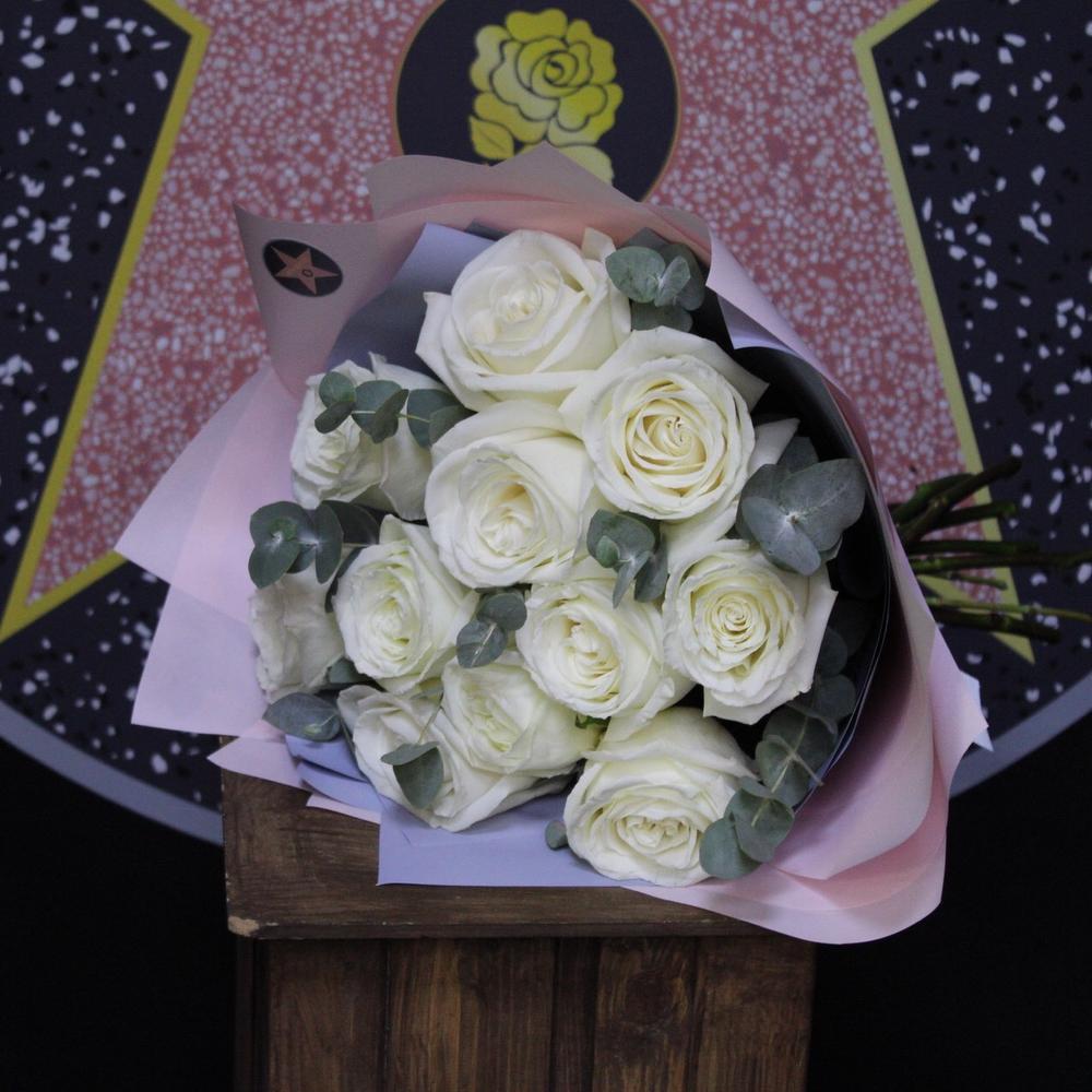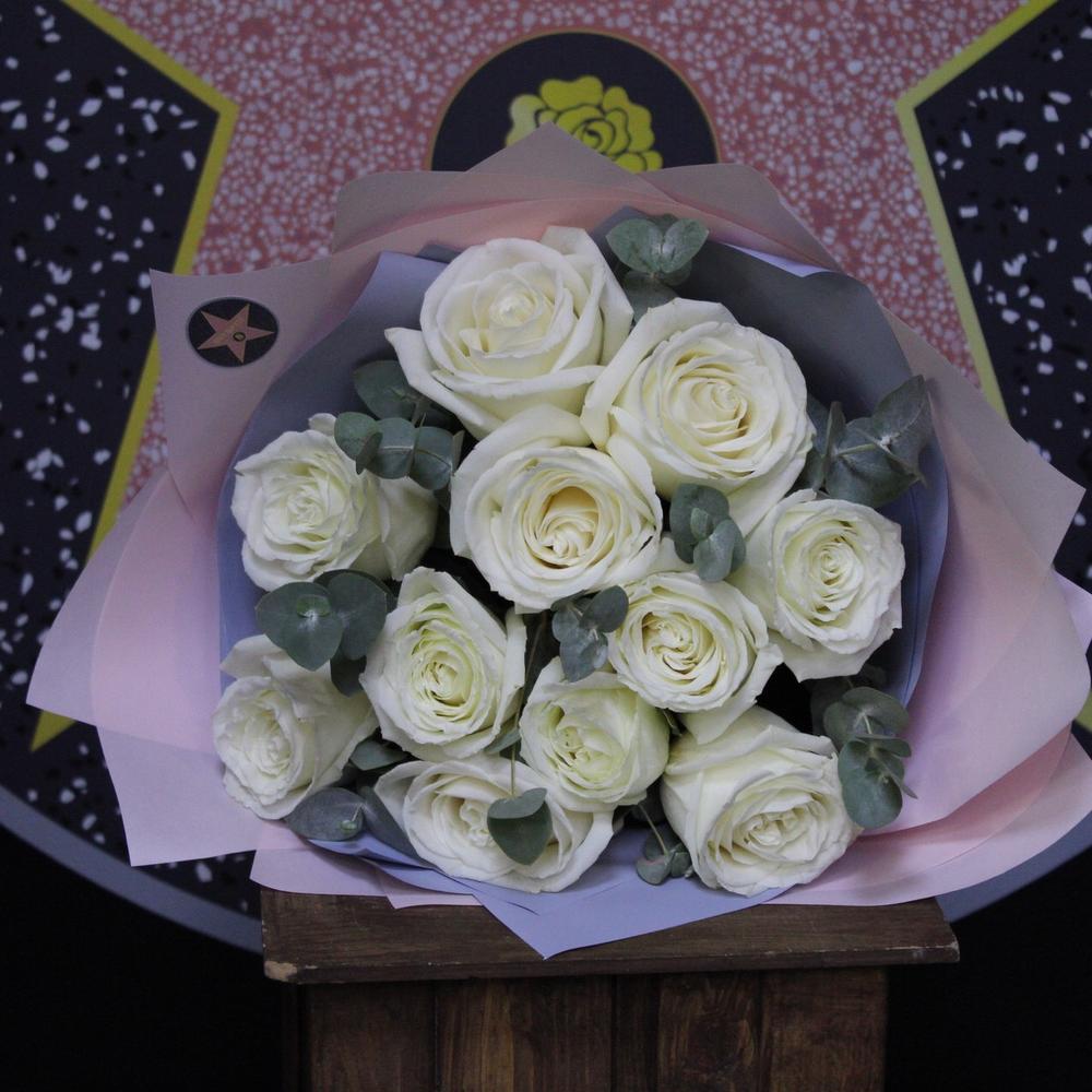 Эвкалипт – 3 шт.Лента атласная – 2 шт.Роза пионовидная – 11 шт.Пленка дизайнерская – 4 шт.