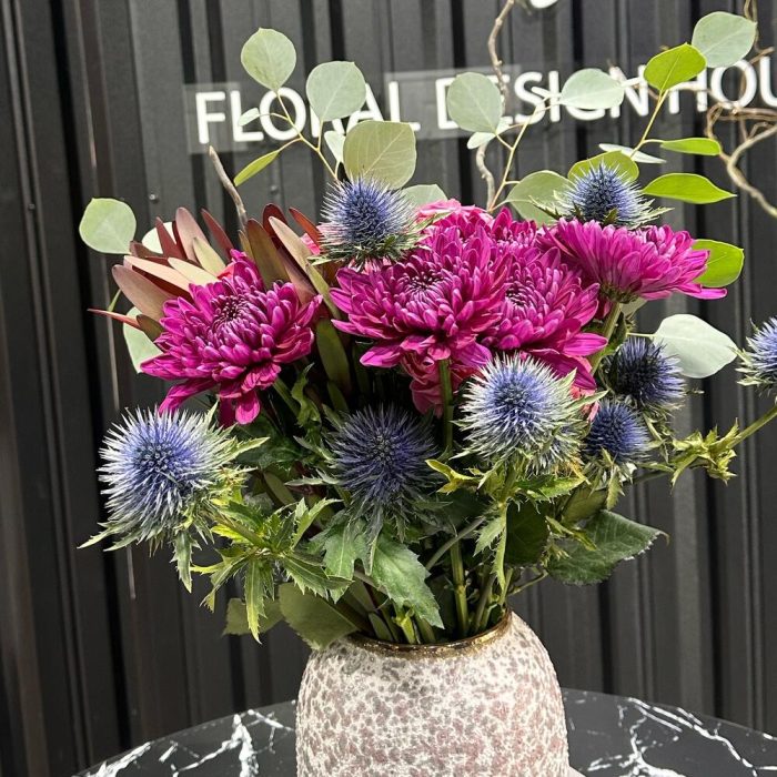 В этом букете эрингиум добавляет нежное синее сияние, напоминающее ясное небо, в то время как хризантема вносит яркость и радость, словно золотые лучи солнца. А роза, своей изысканной красотой и нежностью, придает букету шарм и романтику, словно нежное прикосновение ветра. Все вместе они создают великолепное сочетание форм и оттенков, наполняя окружающее пространство чувственным ароматом и неповторимой красотой.