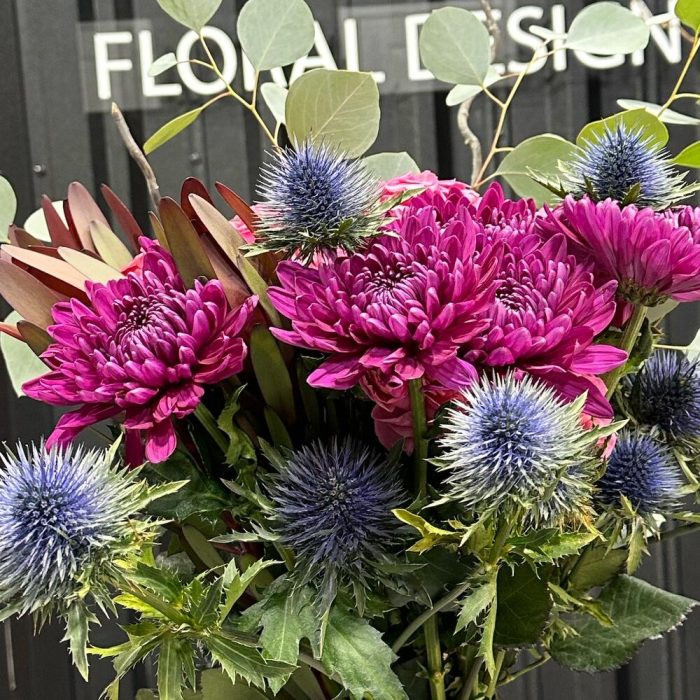 левкадендрон – 3 шт. Эвкалипт – 3 шт. Эрингиум – 3 шт. Хризантема одноголовая – 9 шт. Роза пинк флойл – 9 шт. спрей роза пионовидная – 3 шт.