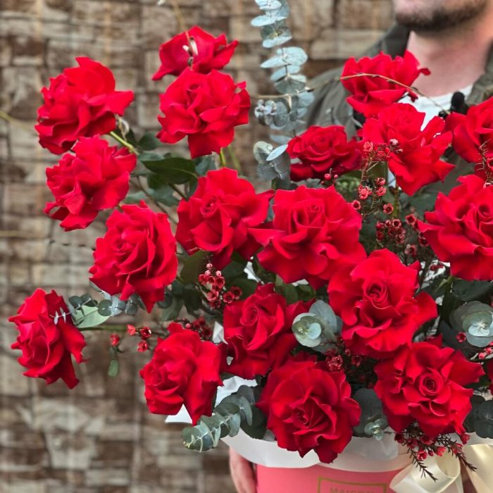 Эвкалипт – 5 шт. Лента атласная – 2 шт. Коробка шляпная – 1 шт. Фисташка – 2 шт. Хамелациум – 5 шт. Роза голландия – 25 шт. Декор – 2 шт. Оазис флористический – 2 шт.