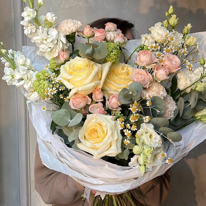 Роза пионовидная – 3 шт.Матрикария (Ромашка Камила) – 3 шт.Роза кустовая пионовидная – 3 шт.Маттиола – 3 шт.Эвкалипт – 1 шт.Вибурнум – 2 шт.Лизиантус – 2 шт.Упаковка дизайнерская – 1 шт.
