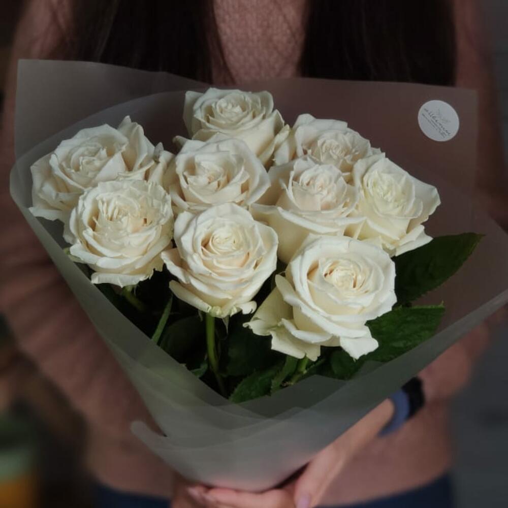 9 белоснежных роз сорта Playa Blanca (Плая Бланка) в моно-букетеКлассическое раскрытие бутона, хорошая стойкостьБукет оформлен упаковкой и атласными лентами