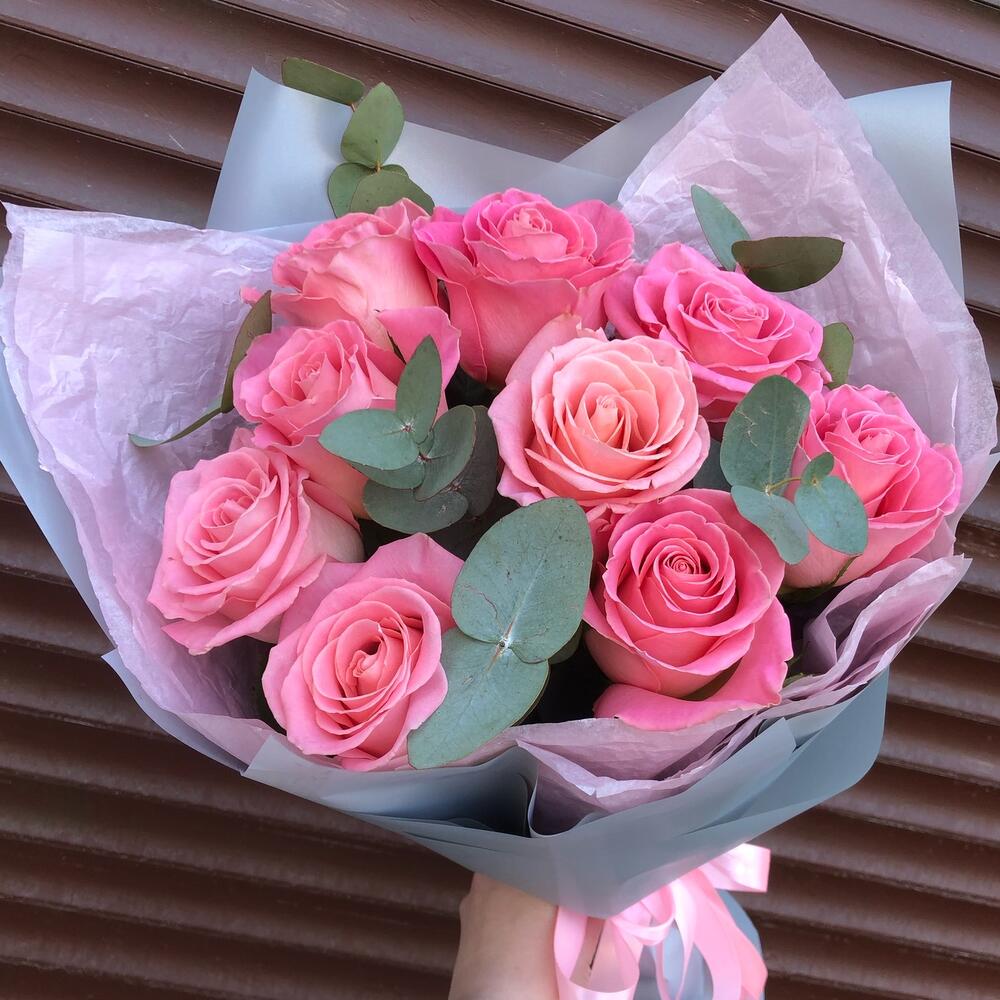 Эвкалипт – 4 шт.Лента атласная – 2 шт.Тишью – 2 шт.роза Hermosa – 9 шт.Пленка матовая – 4 шт.
