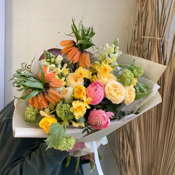 рябчик – 2 шт.Ранункулюс – 2 шт.Роза кустовая пионовидная – 2 шт.Тюльпан пионовидный – 3 шт.Львиный зев – 2 шт.Калина – 2 шт.Нарцисс – 3 шт.Фисташка – 3 шт.Упаковка дизайнерская – 2 шт.Лента атласная – 1 шт.