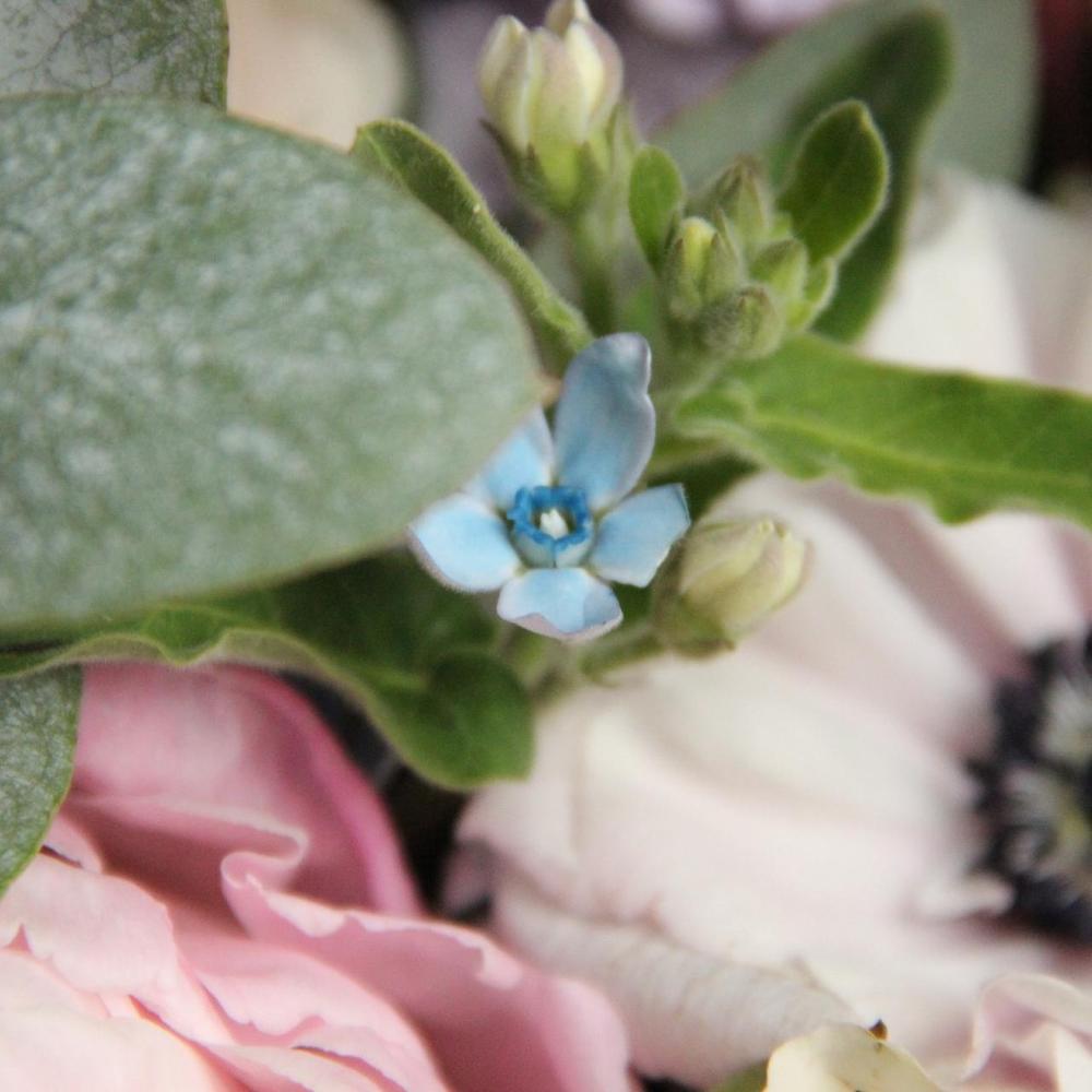 Авторский нежный букет с анемонами, пионами, твидией, матиоллой, лизиантусом и ароматным эвкалиптом, в локаничной упаковке.Стильное цветочное решение для любого случая .