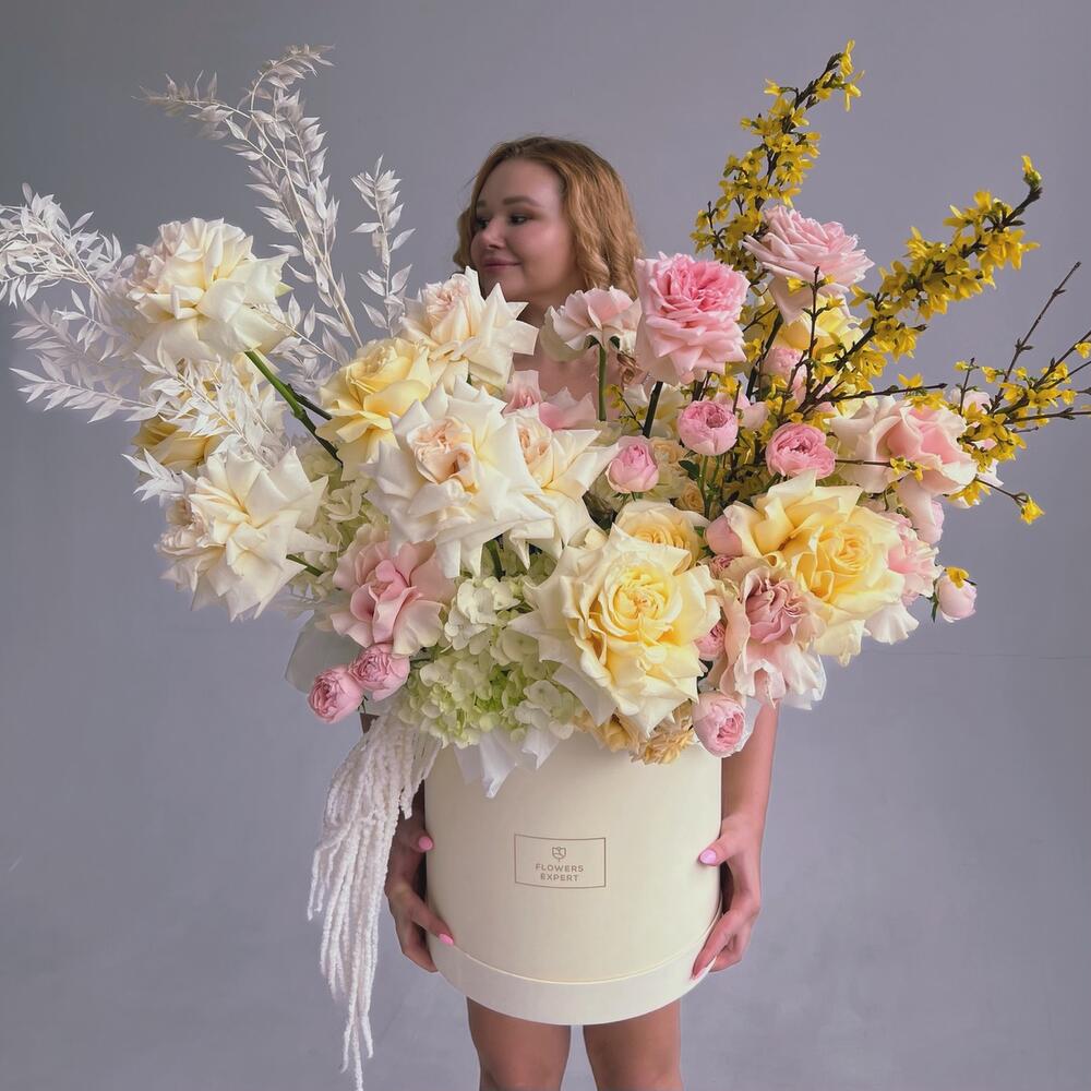 Гортензия – 2 шт.Роза – 19 шт.Кустовая роза – 7 шт.Сухоцветы – 9 шт.Шляпная коробка – 1 шт.Форзиция – 3 шт.