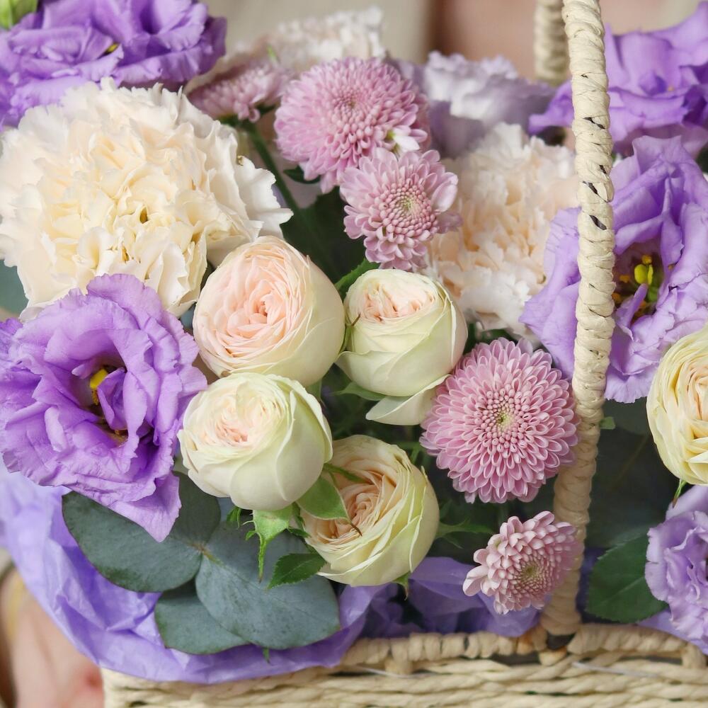 Сантини – 2 шт.Кустовая пионовидная роза – 2 шт.Корзина плетеная – 1 шт.Оазис флористический – 1 шт.Диантус лунный – 3 шт.эустома лавандовая – 2 шт.