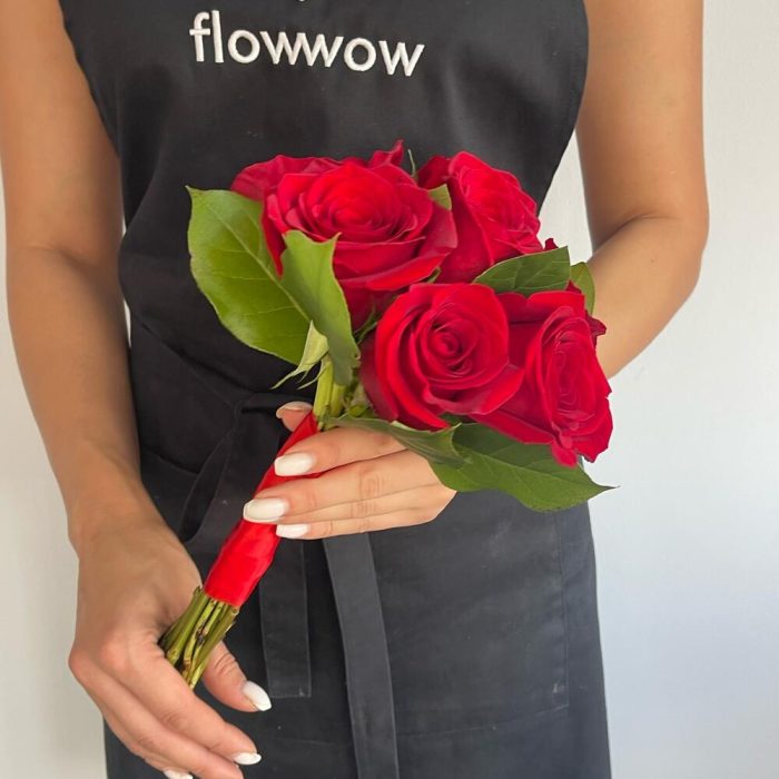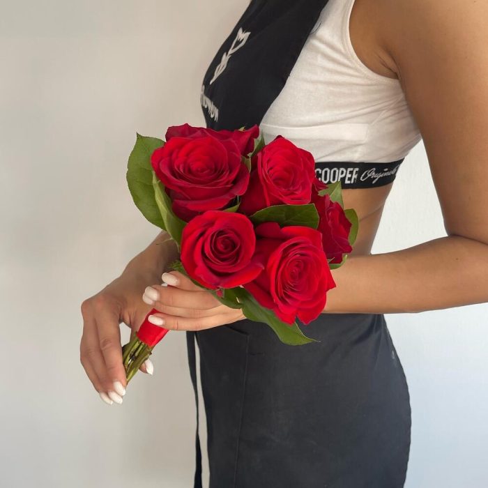 Роза красная – 7 шт.Салал – 5 шт.Лента атласная – 2 шт.Булавка – 1 шт.