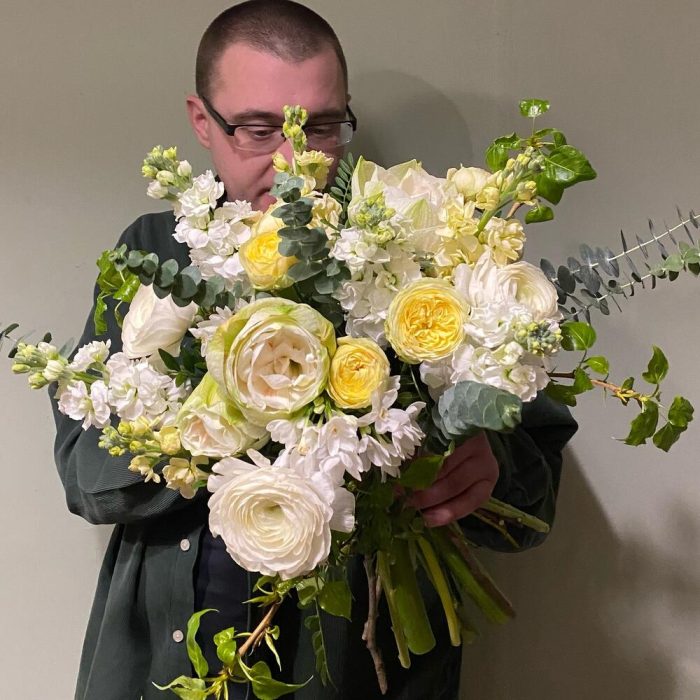 Амариллис – 2 шт.Нарцисс кустовой – 3 шт.Ранункулюс – 4 шт.Маттиола – 7 шт.Роза пионовидная кустовая – 3 шт.Эвкалипт – 9 шт.Ветки – 2 шт.Сирень белая – 2 шт.