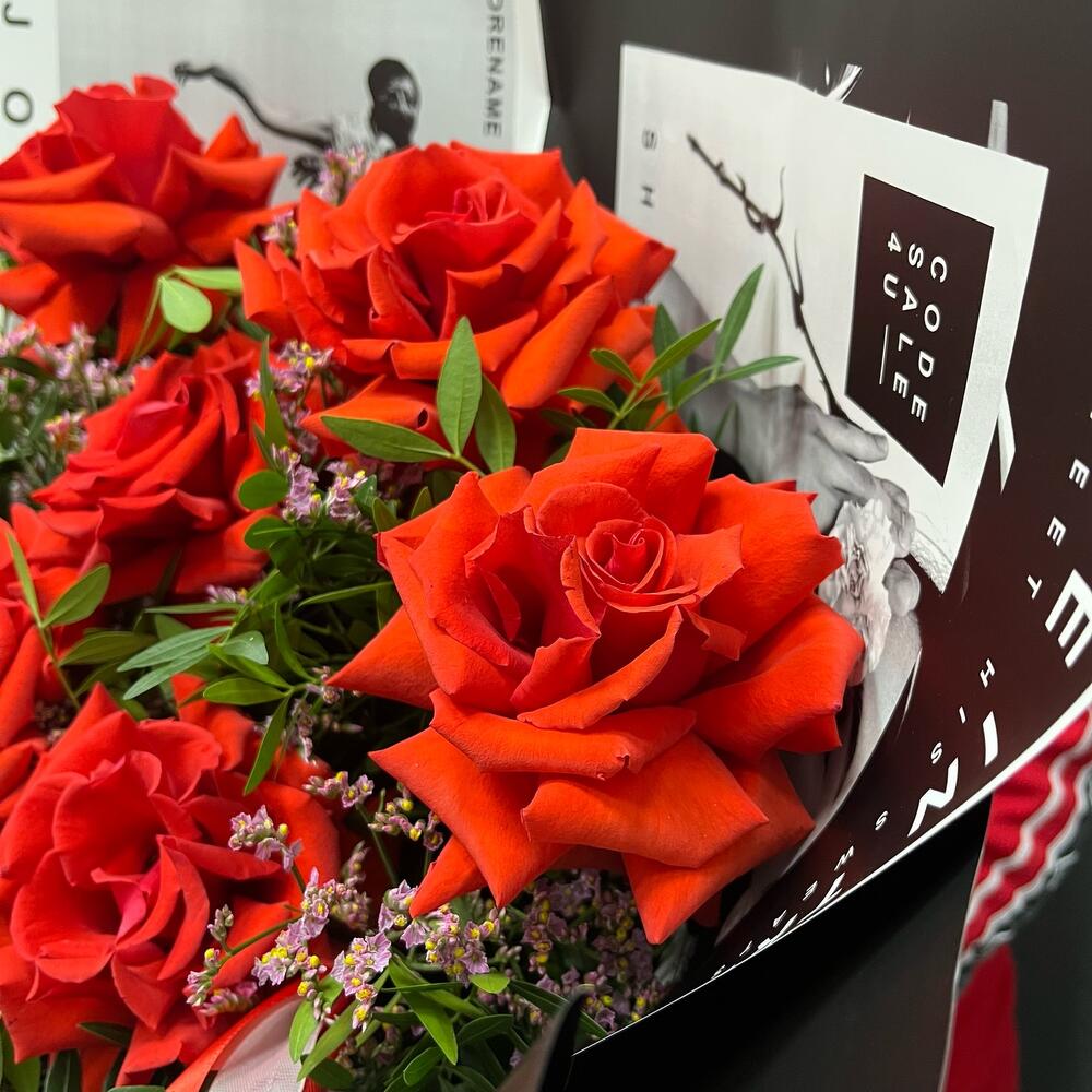 Лимониум – 3 шт.Лента атласная – 3 шт.упаковка дизайнерская пленка – 1 шт.фисташка зелень – 5 шт.роза французская алая премиум нина – 7 шт.