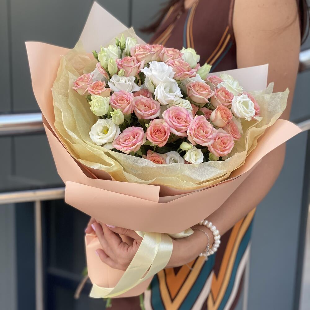 кустовая роза азора – 5 шт. эустома белая – 4 шт. Оформление – 1 шт. Писташ – 2 шт.
