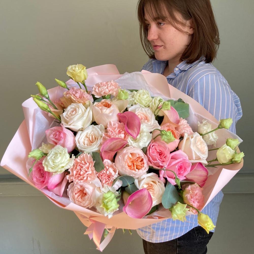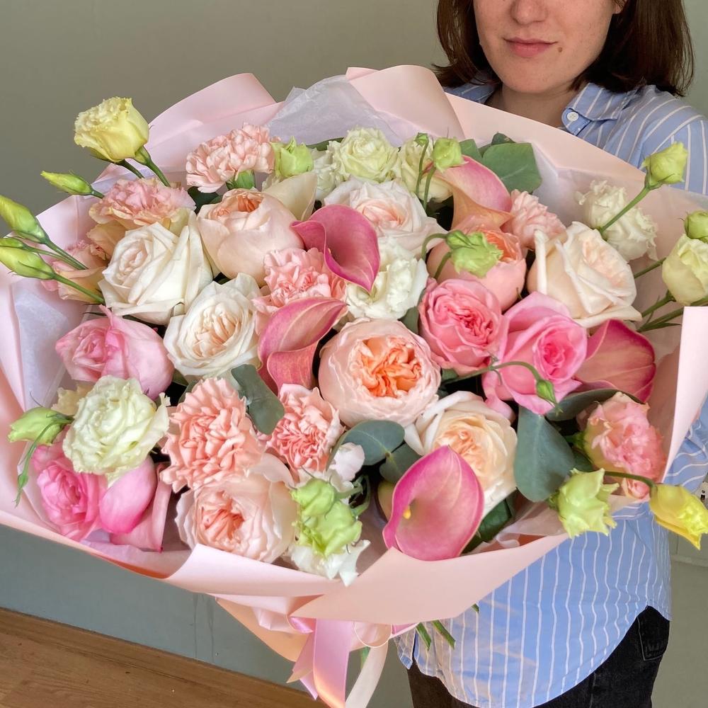 Авторский букет с пионовидными розами, каллами, лизиантусом, гвоздиками и эвкалиптом.Стильное цветочное решение для любого случая.