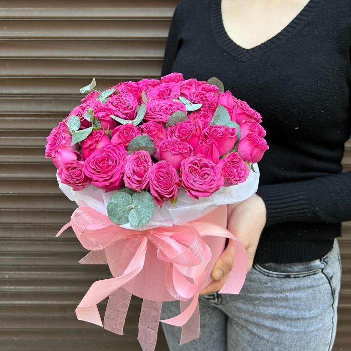 Эвкалипт – 1 шт.Лента атласная – 2 шт.Тишью – 1 шт.Коробка шляпная – 1 шт.Оазис флористический – 1 шт.классик сенсейшен – 11 шт.