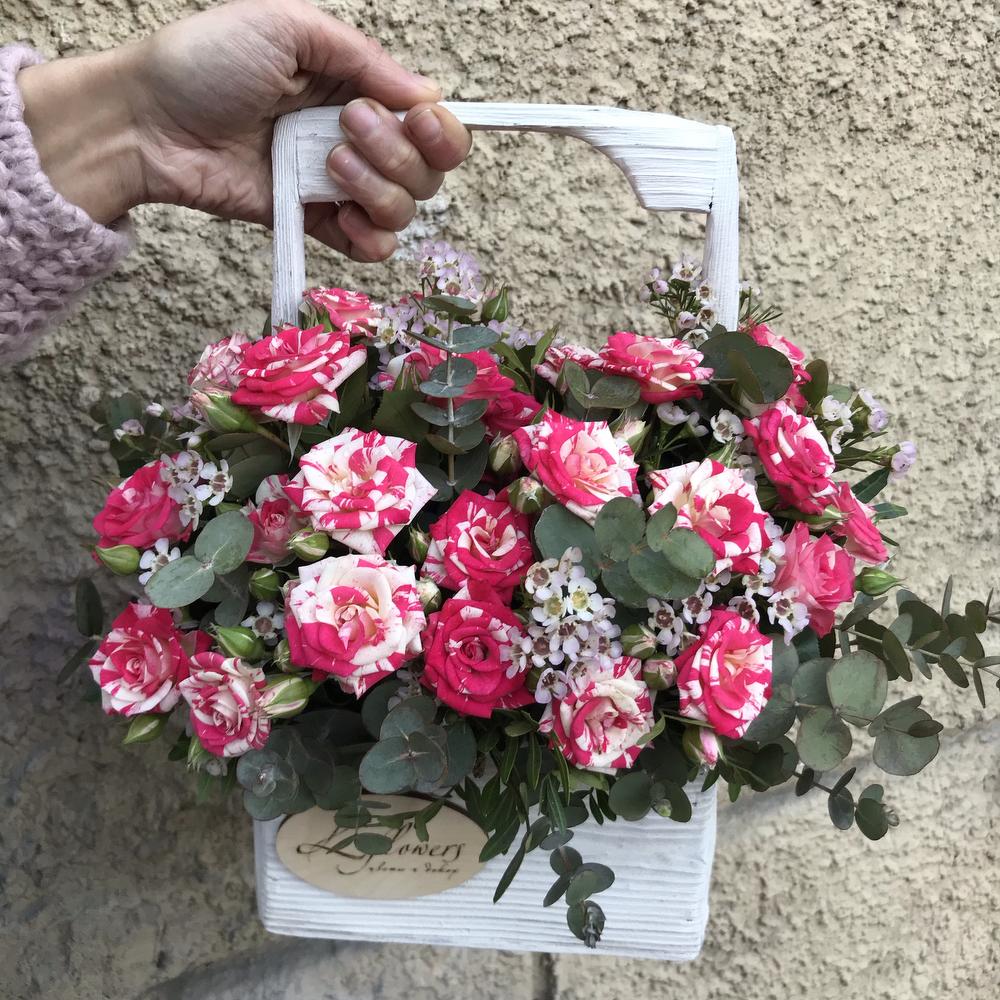 Яркие мраморные кустовые розы в стильном деревянном ящике ручной работы