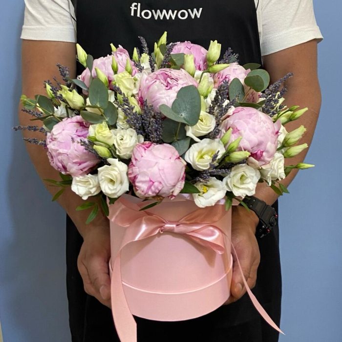 Лаванда – 25 шт.Эвкалипт – 5 шт.Эустома – 4 шт.Пион Сара Бернар – 7 шт.Шляпная коробка с лентами – 1 шт.