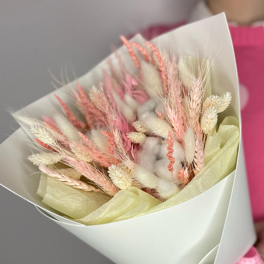 Лента – 2 шт.Тишью – 1 шт.Хлопок натуральный – 3 шт.Лагурус (сухоцвет) – 23 шт.Пшеница (сухоцвет) – 19 шт.Фоамиран (упаковка) – 1 шт.фаларис сухоцвет – 19 шт.рускус стабилизированный – 1 шт.мискантус – 3 шт.колоски розовые – 15 шт.
