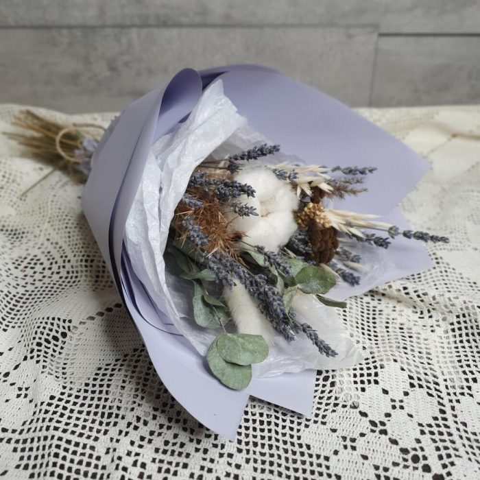 Танацетум – 1 шт.Упаковка дизайнерская – 1 шт.Хлопок натуральный – 1 шт.Лагурус (сухоцвет) – 3 шт.Эвкалипт сухоцвет – 1 шт.овес сухоцвет – 2 шт.сорго – 1 шт.лавандин пучок – 1 шт.камыш декоративный пучок – 1 шт.