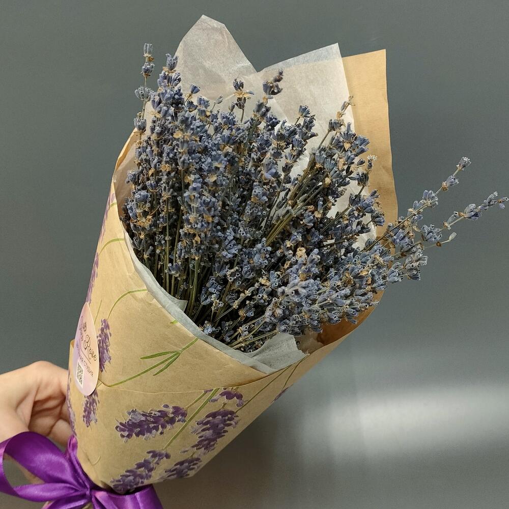 Лаванда (сухоцвет) – 100 шт.Тишью – 1 шт.Крафт упаковка – 1 шт.Лента атласная – 1 шт.