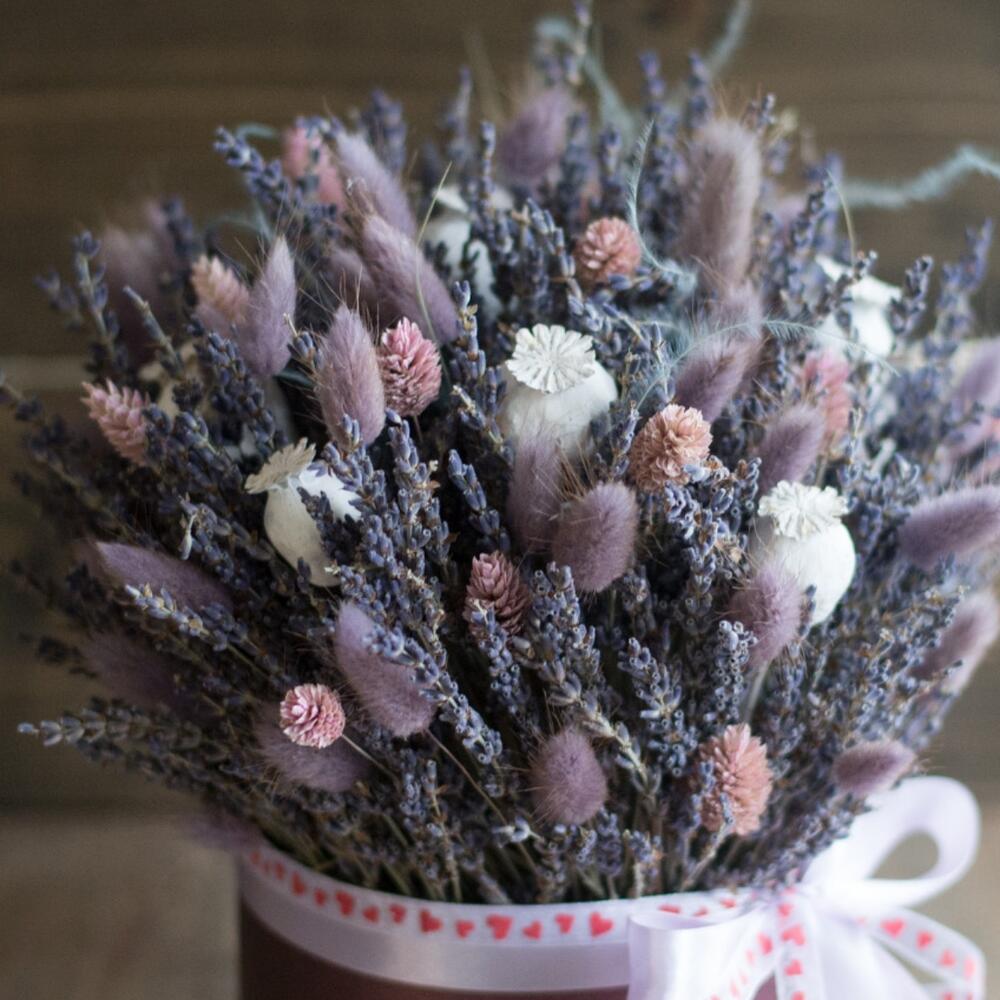 Лаванда (сухоцвет) – 159 шт.Лагурус (сухоцвет) – 30 шт.Шляпная коробка с лентой – 1 шт.Оазис флористический – 1 шт.