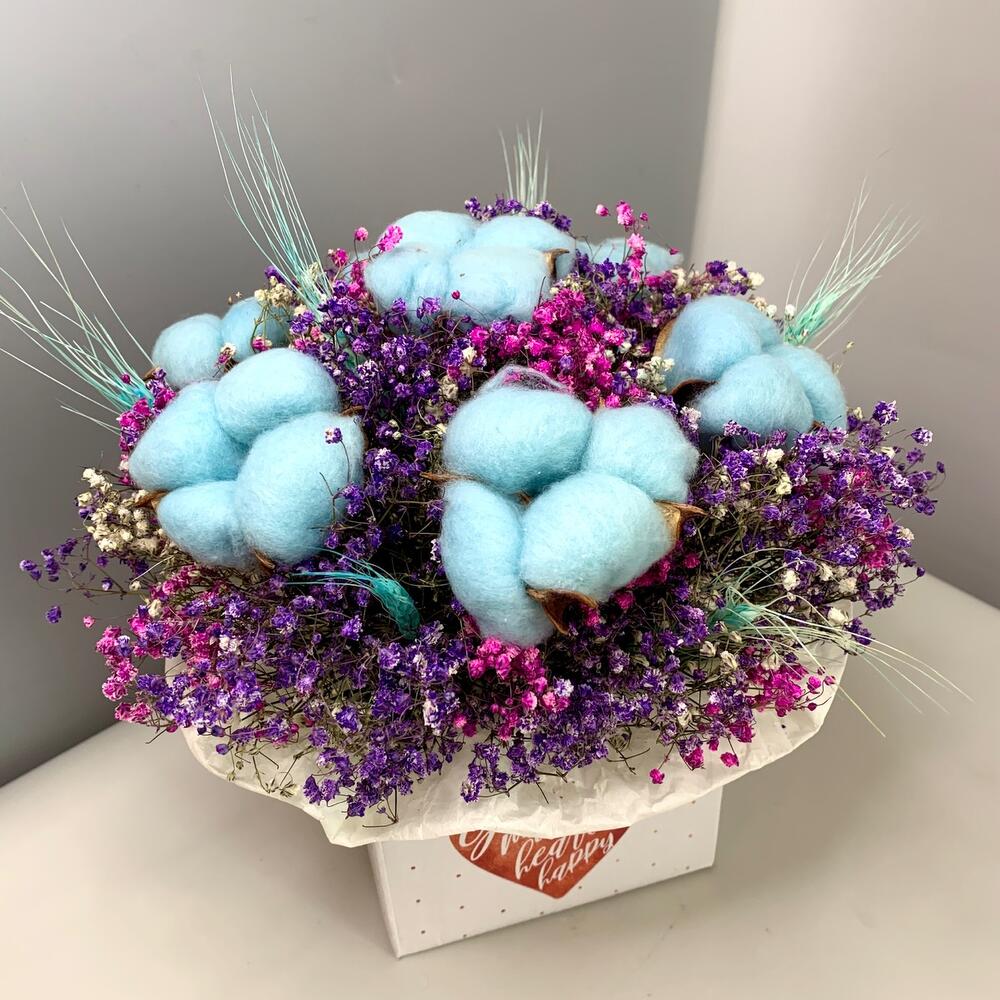 Хлопок – 7 шт.Лента атласная – 2 шт.Тишью – 2 шт.Коробка – 1 шт.Пленка прозрачная – 1 шт.Оазис флористический – 1 шт.Тритикум(пшеница) – 6 шт.гипсофила сухоцвет – 10 шт.